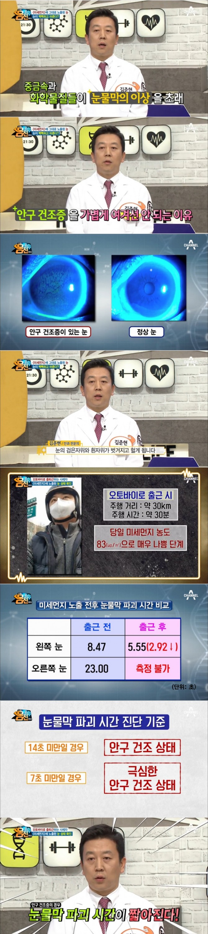 김준현 전문의는 미세먼지가 눈에 미치는 영향을 파악하기 위해 오토바이로 출근하는 사례자의 안구상태를 검사한 결과를 공개했다.